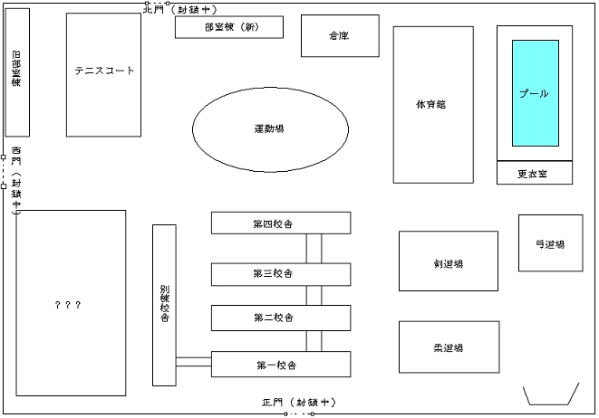 それがこちら!(クリックで拡大して見てください) 小説の舞台である学校の見取り図です! 素人が作ったものなので、多少・・どころかかなり見づらかったり、建物の配置がありえないだろ!ってことになってますが、そこはフィクションということでww ちなみに左下の「???」というところは、主人公達が入ったことがないからわからないということになってます。 べ、別にスペースが空いちゃったから適当に作ったってわけじゃないんだからね!;; とりあえずこれを見取り図その①ということにして、これから時間があれば各校舎内の図面とかも作っていきたいです。 ・・・計画倒れに終わるかもしれませんけどね! 2010.09.11 Sat 17:04:08 13 罠 戦争初日。午前10時30分。 「わ、わぁぁっ!!」 ドンッ、と逆に中から突き飛ばされた。 2010.08.25 Wed 21:58:53 12 テカり戦争初日 午前10時30分